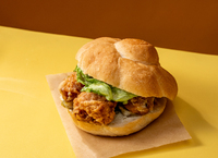 罗塞塔面包胚,夹入外酥里嫩的唐扬鸡块,缀以酸黄瓜的清爽与西生菜的脆嫩,口感层次丰富...