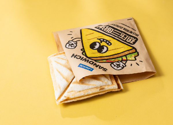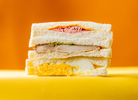 以全麦吐司为基底,依次叠加黑椒鸡胸肉、厚蛋卷、西生菜、西红柿、火腿、玉米粒。